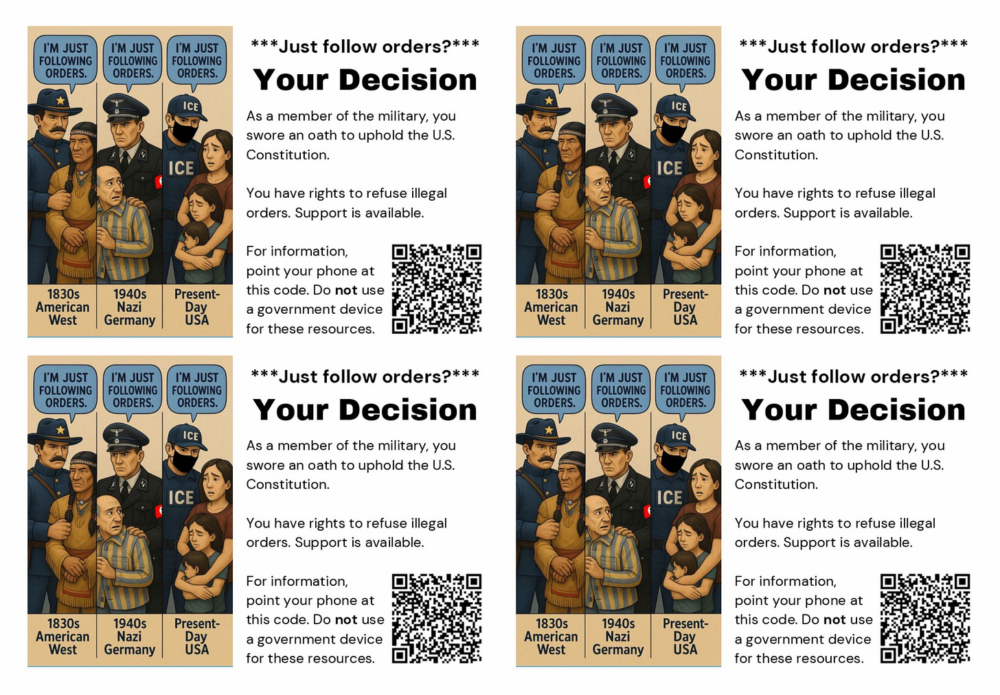 On April 21, 2025 I wrote my first post about a campaign in which I was collaborating with another activist to make military personnel aware that they may be told to carry out orders that go against the Constitution and the laws of the United States. Our principle concern was that Donald Trump would order US military personnel to be deployed within our borders to round up U.S. citizens or immigrant families for detention or deportation — whether or not they have committed a crime.